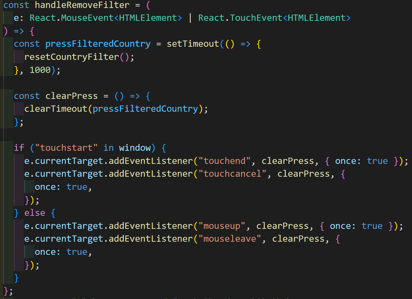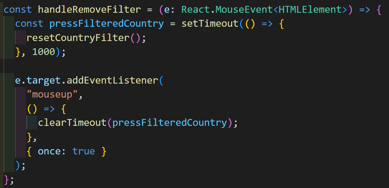 - 필터 단어를 누르면 n초 뒤에 삭제되도록 setTimeout을 걸어두고, mouseup이 지정된 시간 전에 일어나면 꾹 누르는게 취소되었으니 clearTimeout으로 setTimeout을 삭제시킴