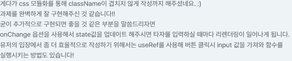 확실히 input의 변화를 onChange로 감지하면서 '아 입력할 때마다 input의 값을 실시간으로 가져오는구나'라고만 생각했지 매번 리렌더링이 일어난다고 생각해보지 않았던 것 같다. 부분적으로 작은 범위의 리렌더링이라 신경쓰지 못했던 것 같고, 피드백에서 언급해주시지 않았다면 계속 이 방법대로 썼을 것 같은데 새로운 방법을 알게 되었다.(피드백 최고..!)
