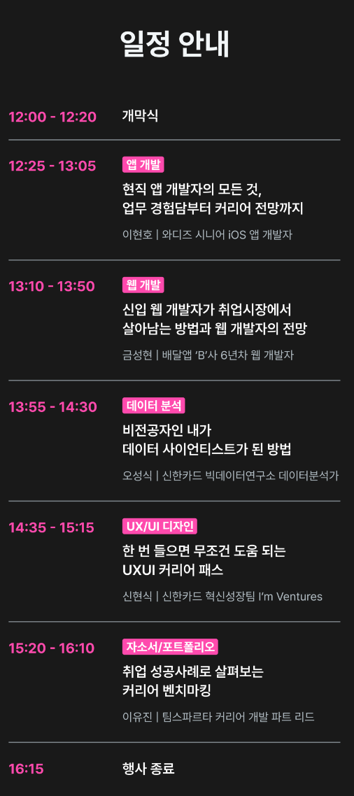 다양한 직군에 따른 세션들이 마련되어 있었는데, 내가 희망하는 프론트엔드와 관련이 깊은 직군들이어서 더욱 열심히 들었다. 특히 첫 번째 세션인 이현호 님의 발표가 정말 흡입력 있어서 앞으로 있을 세션들에 대한 기대감이 커졌다. 특히나 많은 발표자분들께서 개발자의 역량 중 하나로 '내가 같이 일하고 싶은 사람'을 말씀해 주셨는데, 다행히 현재 진행 중인 내일배움캠프에서 몇 주가 멀다 하고 팀이 바뀌기에 다양한 사람을 경험해 볼 수 있어, 다른 사람의 어떤 면이 같이 일하고 싶은 요소인지 살펴볼 충분한 기회가 있을 것 같다.