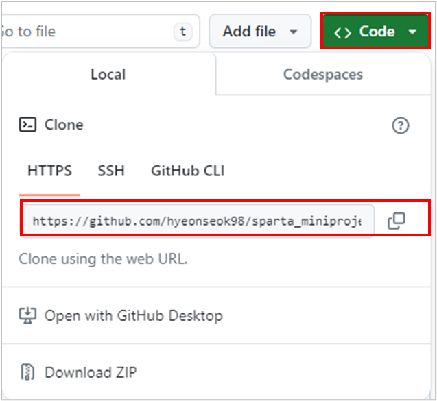 1. 원하는 github project의 repository에 들어가서 프로젝트 url을 복사한다.