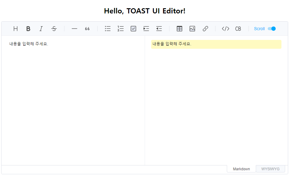 - NHN에서 개발한 github 1만 스타를 받은 오픈소스로 markdown과 wysiwyg 방식 모두 지원하며 다국어 지원