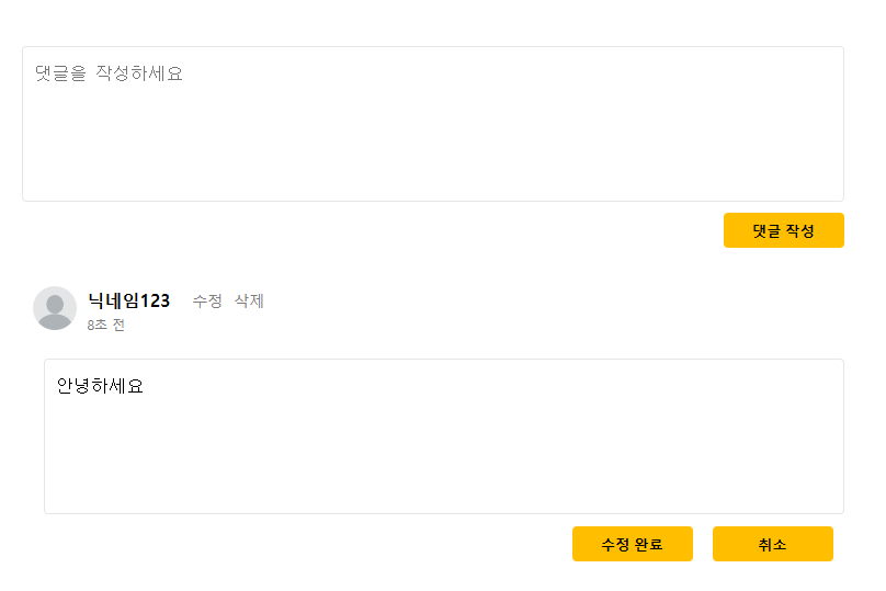 이전에는 댓글 위치만 레이아웃으로 위치만 시켜두었는데, 오늘에서야 최종적으로 기능 완성을 시켰다. 본인 댓글만 수정/삭제 가능하게 하였고, 언제 댓글이 달렸는지 확인할 수 있게 하였다.