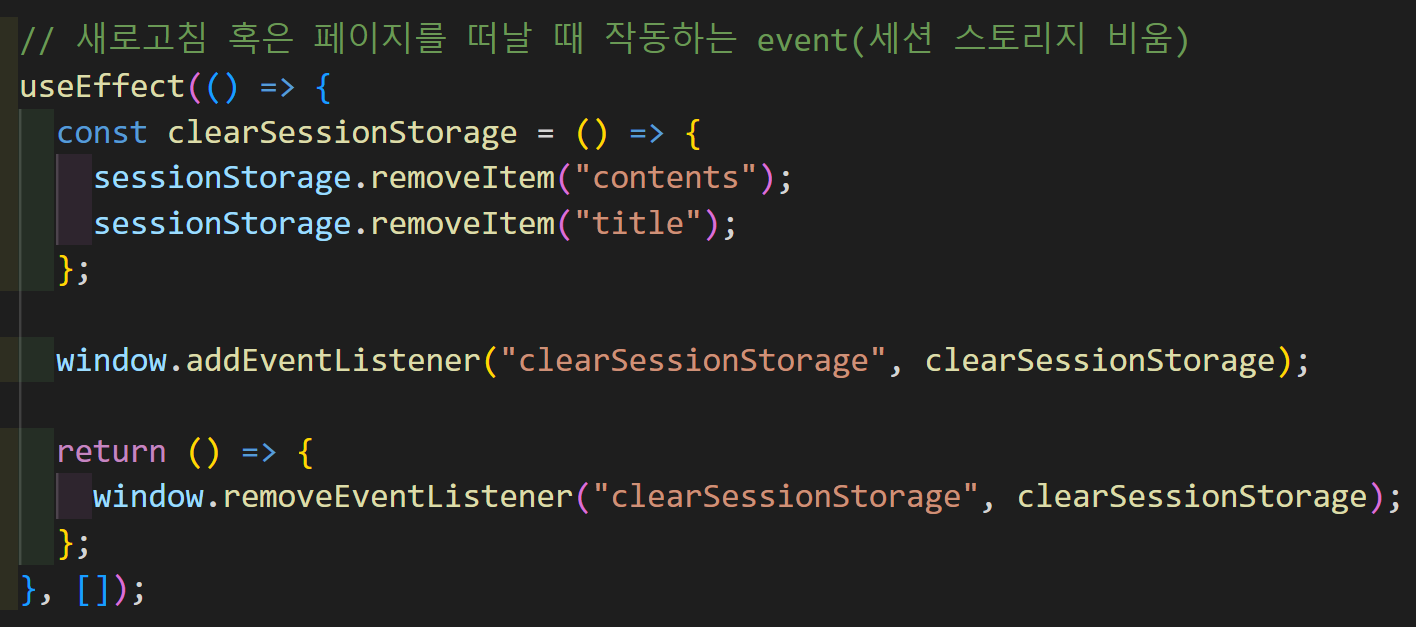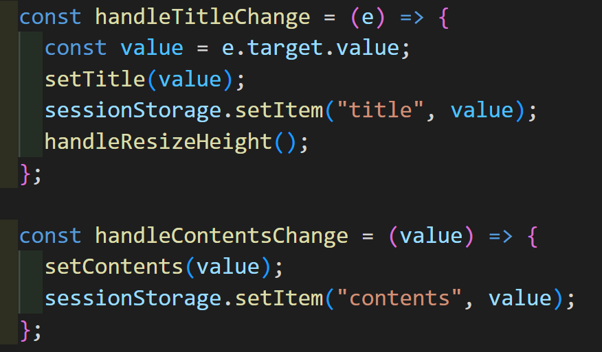 아래 함수와 같이 제목과 본문을 입력하면 세션 스토리지에도 저장되게 로직을 구현했다. 처음에는 리렌더링 최소화를 위해 useRef를 통해 '작성완료' 버튼을 누를 때만 세션 스토리지에 저장되게 하였는데, 그 경우 페이지를 새로고침 하게 되면 내용 유지가 되지 않아 useState를 사용하여 저장하게 되었다. 하지만 새 글 작성 페이지에는 다른 요소들을 배치하지 않고 글 작성에만 집중할 수 있게 간소화된 UI를 가지고 있어 useState를 사용해도 별다른 성능 저하가 일어나지 않을 것 같았다.