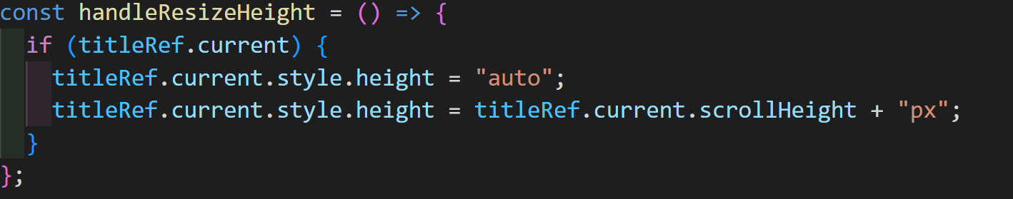 textarea를 useRef를 통해 DOM 조작할 수 있게 설정한 뒤, handleResizeHeight 함수를 통해 텍스트 영역의 스크롤 높이를 가져와 그 값으로 텍스트 영역의 높이를 설정할 수 있게 작성했다.