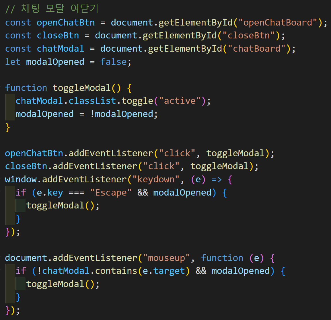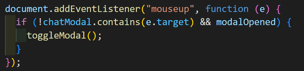 다른 방법은 무엇이 있을까 고민하던 와중, 굳이 container로 영역을 따로 지정할 것이 아니라, 모달창 이외의 영역만 구분해 주면 된다는 간단하고 명료한 해결책이 떠올랐습니다. 모달창이 열려 있을 때 모달창 이외의 영역 어느 곳이든 클릭하여 mouseup 이벤트가 발생한다면 기존에 모달을 여닫을 때 사용하던 toggleModal()을 호출하여 모달창이 닫히게 하는 것이었습니다.
