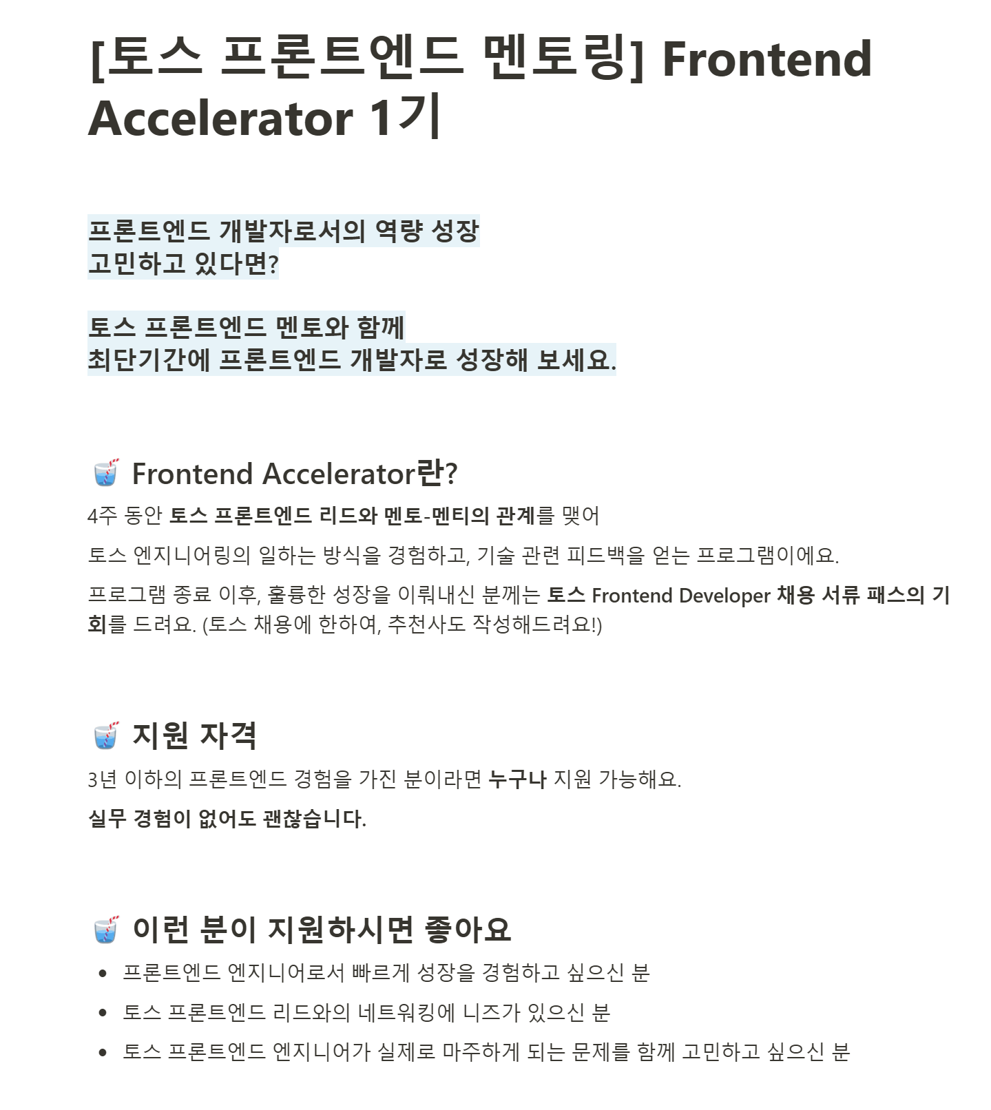 매일 여러 개발 글을 탐험하다가 본 Toss Frontend Accelerator 프로그램. 정말정말 좋은 기회고 되면 좋겠다 싶지만 테스트도 있고 커피챗까지 있는 걸 봐서 지원하고, 지원한 모두에게 주어지는 테스트를 맛볼 수 있는 기회이기에 지원해 보았다.