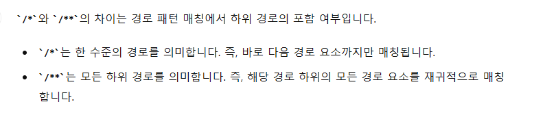 pathname을 작성하다가 알게 된 내용. /**을 사용하여야 해당 경로 이하의 모든 경로들을 포함한다고 한다.