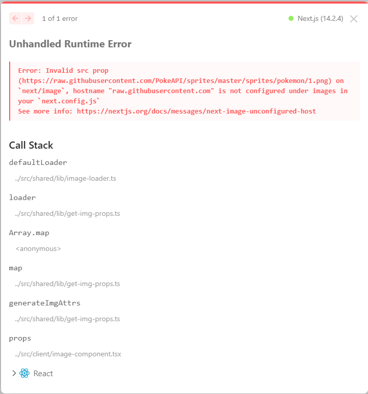 이렇게 외부 API를 사용하여 포켓몬들의 리스트들을 격자형태로 만들어주는 것이 시작이었는데, 정적인 이미지 파일이 아닌 외부의 이미지 파일을 사용하려니 아래와 같은 에러가 생겼다